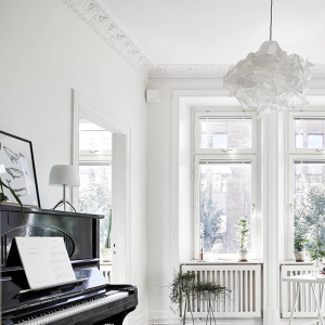 Takpaneler skapar imponerande hem. Här i sekelskiftesbostad i Stockholm.- Här syns taklist Z144 och takplafond K250. Tips: taklist Z144 finns flera olika storlekar, se därför även taklist Z130, taklist Z143 och taklist Z145. Design av inredaren Louise Hjort.