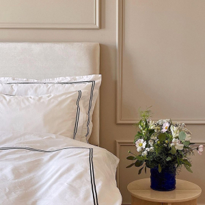 Med en kornisch gömmer du enkelt gardinfästet och skapar en lyxig hotellkänsla. Skapa stilen i bilden med kornisch QL026 och vägglist Z352.