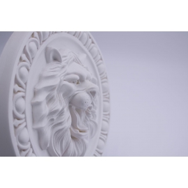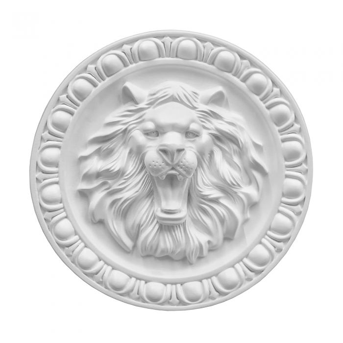 Detta vackra lejonhuvud har en rund bas och pryds av ett detaljerat lejonhuvud i relief. Lejonets ansikte har ett majestätiskt uttryck med öppna käkar, vilket framhäver dess styrka och kunglighet. Manen är utförligt skulpterad med mjuka, böljande linjer som ger en känsla av rörelse och fyllighet. Den yttre kanten av basen är dekorerad med ett klassiskt pärlmönster, vilket förstärker ornamentets elegans och gör det till ett imponerande tillskott till vilken vägg, dörr eller yta som helst.